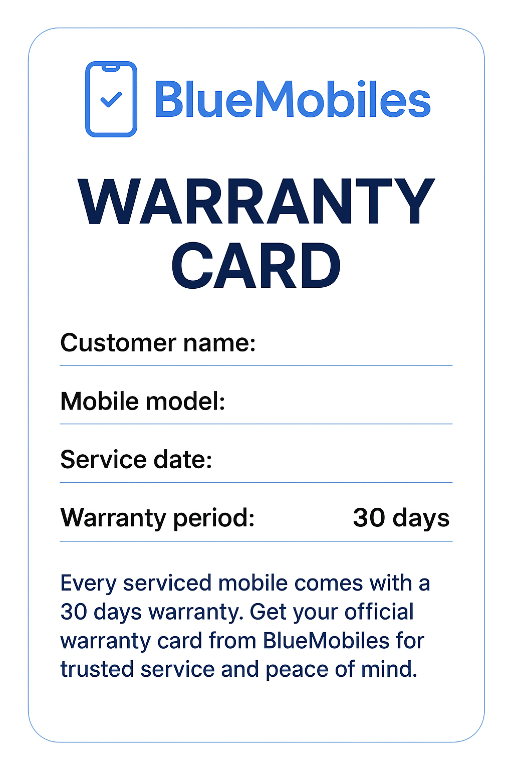 Activating your External Mobile Service Warranty Plan is quick and easy. Simply contact Blue Mobiles via WhatsApp, provide your device details, and select the plan that fits your needs. Once activated, you’ll receive a warranty card mobile service and documentation, making any future claims smooth and transparent. For even greater peace of mind, you can also opt for a Smartphone protection plan to ensure your device stays safe and fully covered long-term.